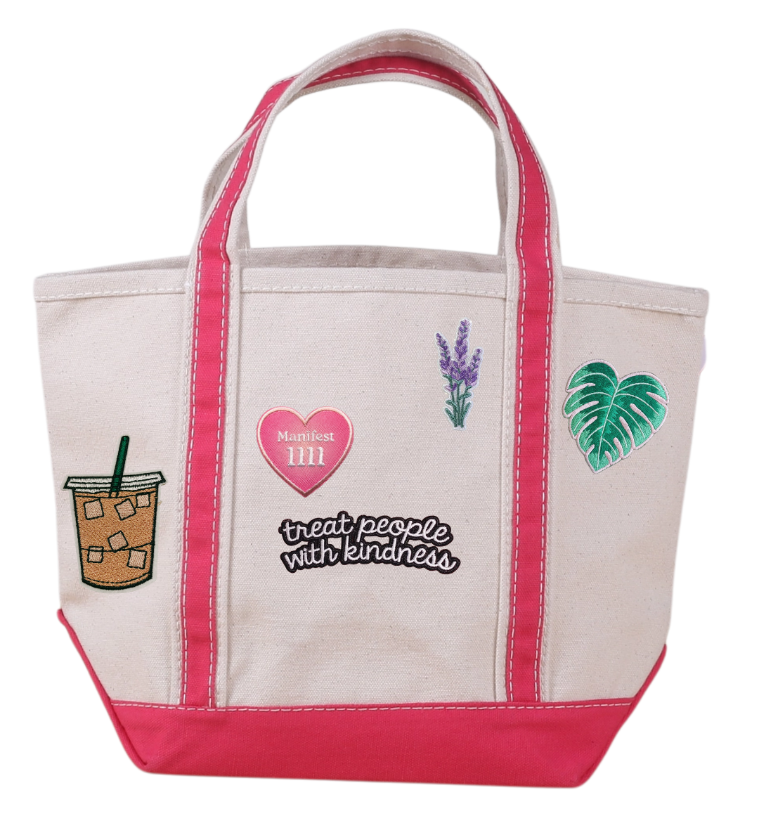 Pink Mini Tote Bag with Treat People with Kindness, Iced Coffee, Manifest & Floral Patches