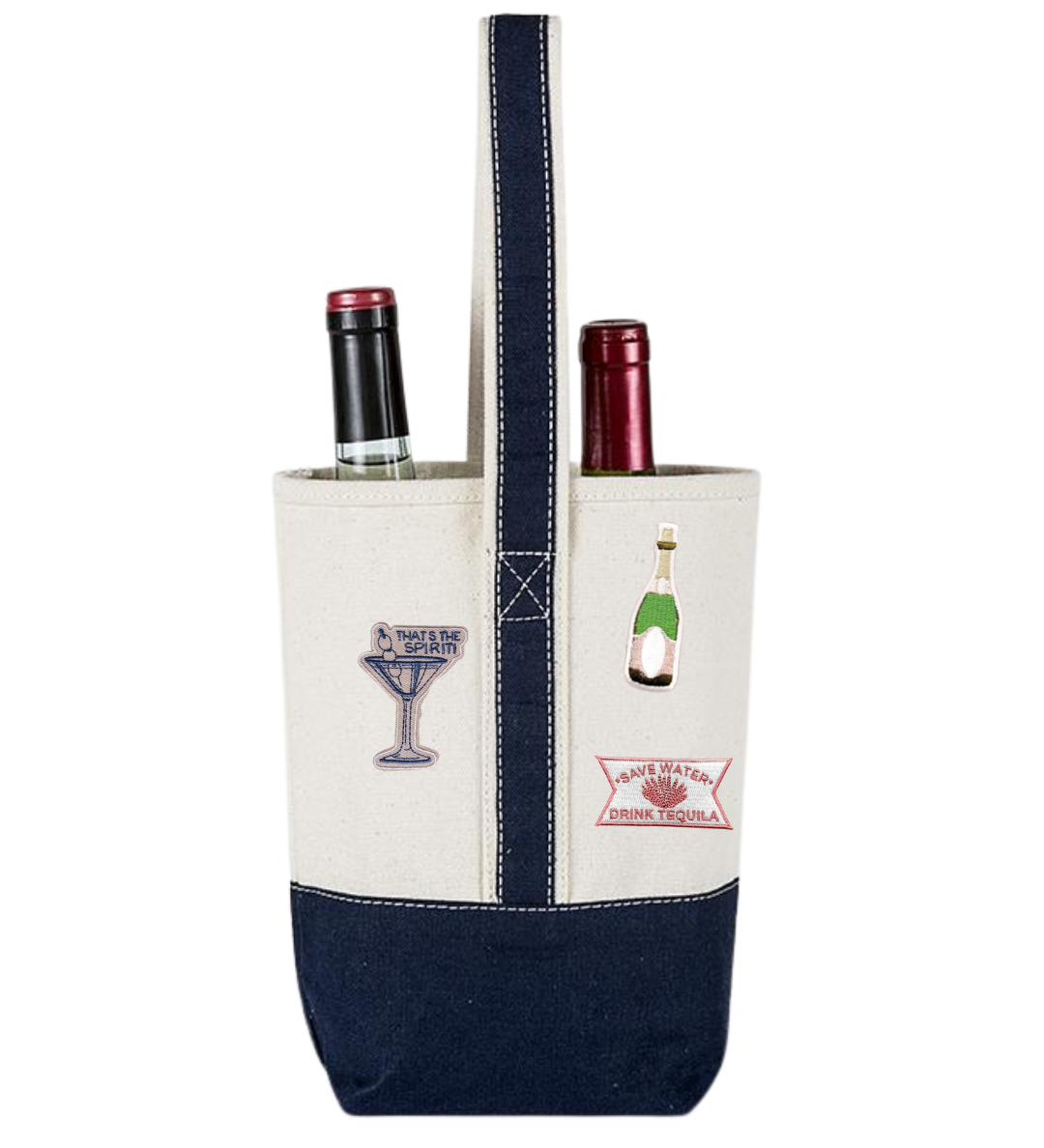 Navy Blue Double Wine Bottle Tote Bag with Drink Themed Patches