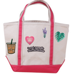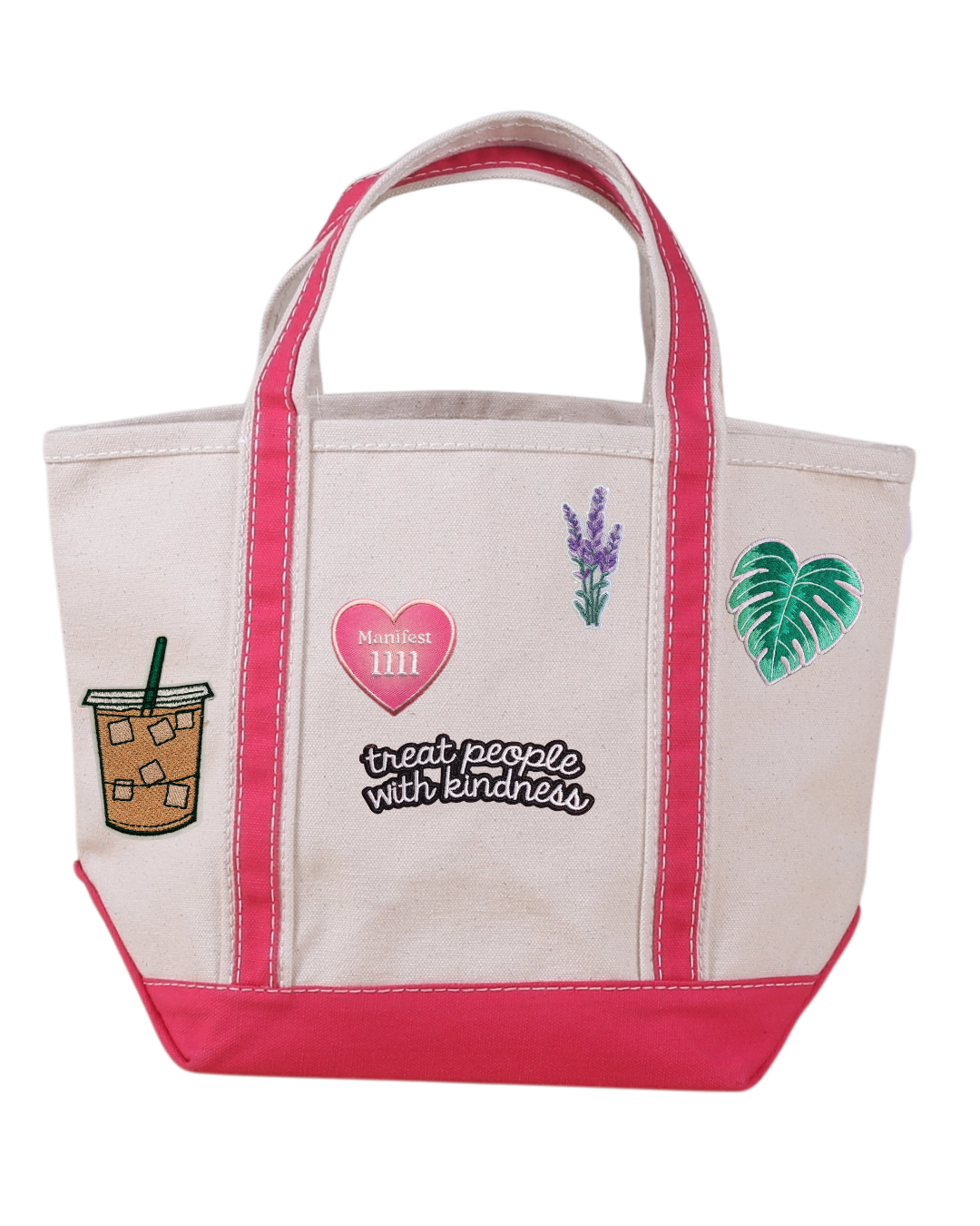 Pink Mini Tote Bag with Treat People with Kindness, Iced Coffee, Manifest & Floral Patches