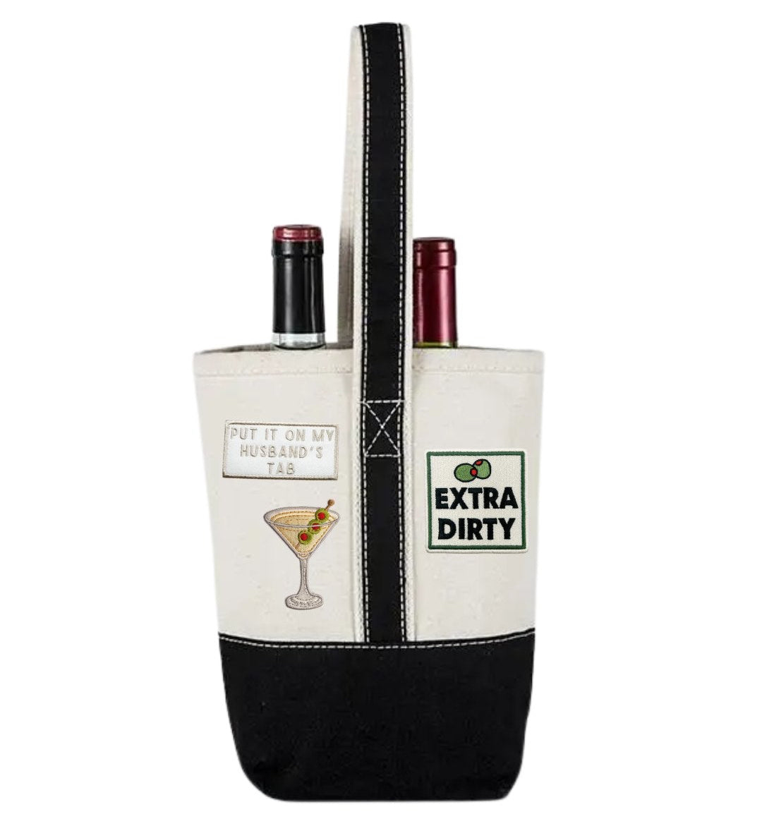 Black Double Wine Bottle Tote Bag with Dirty Martini Themed Patches
