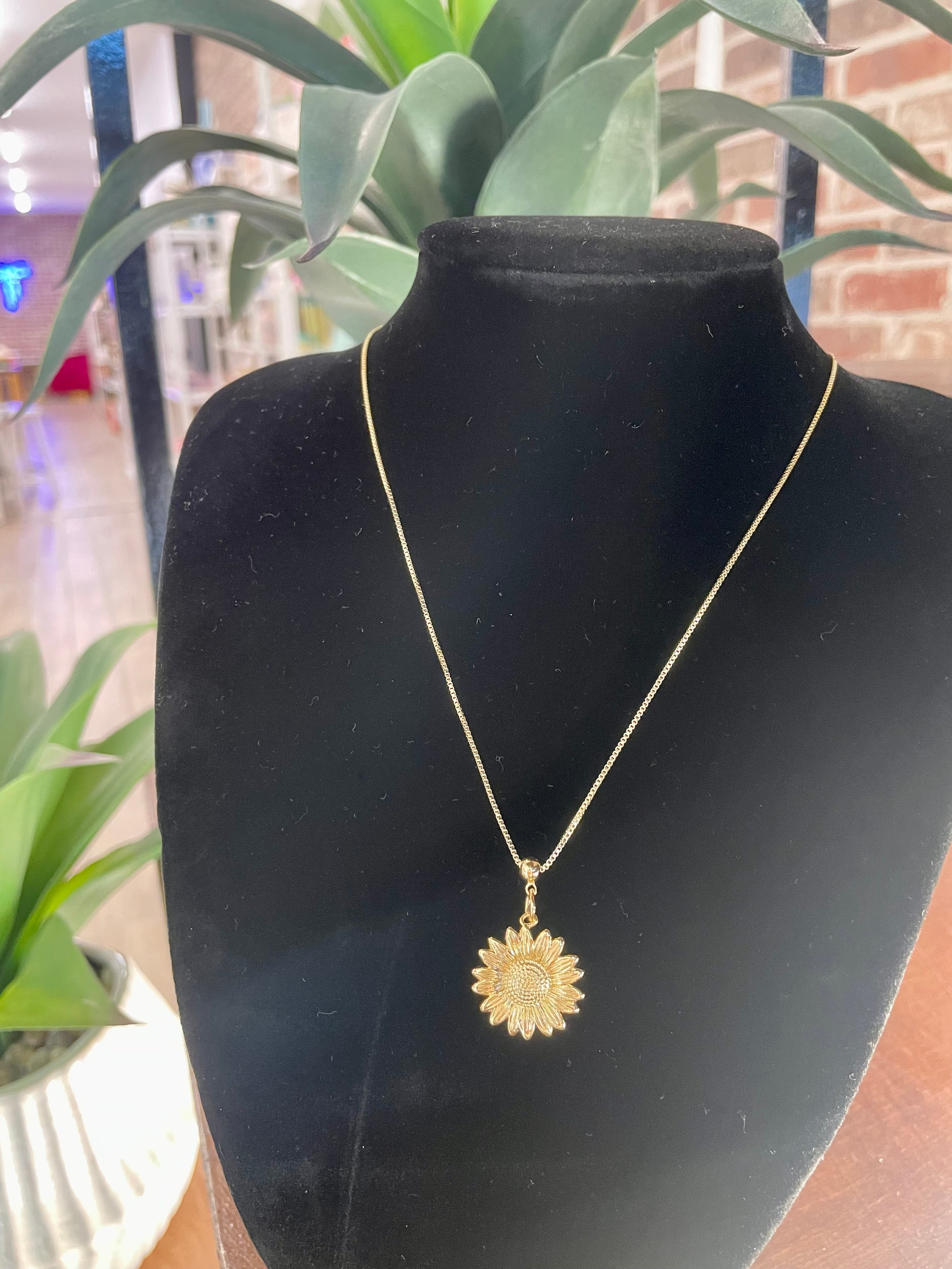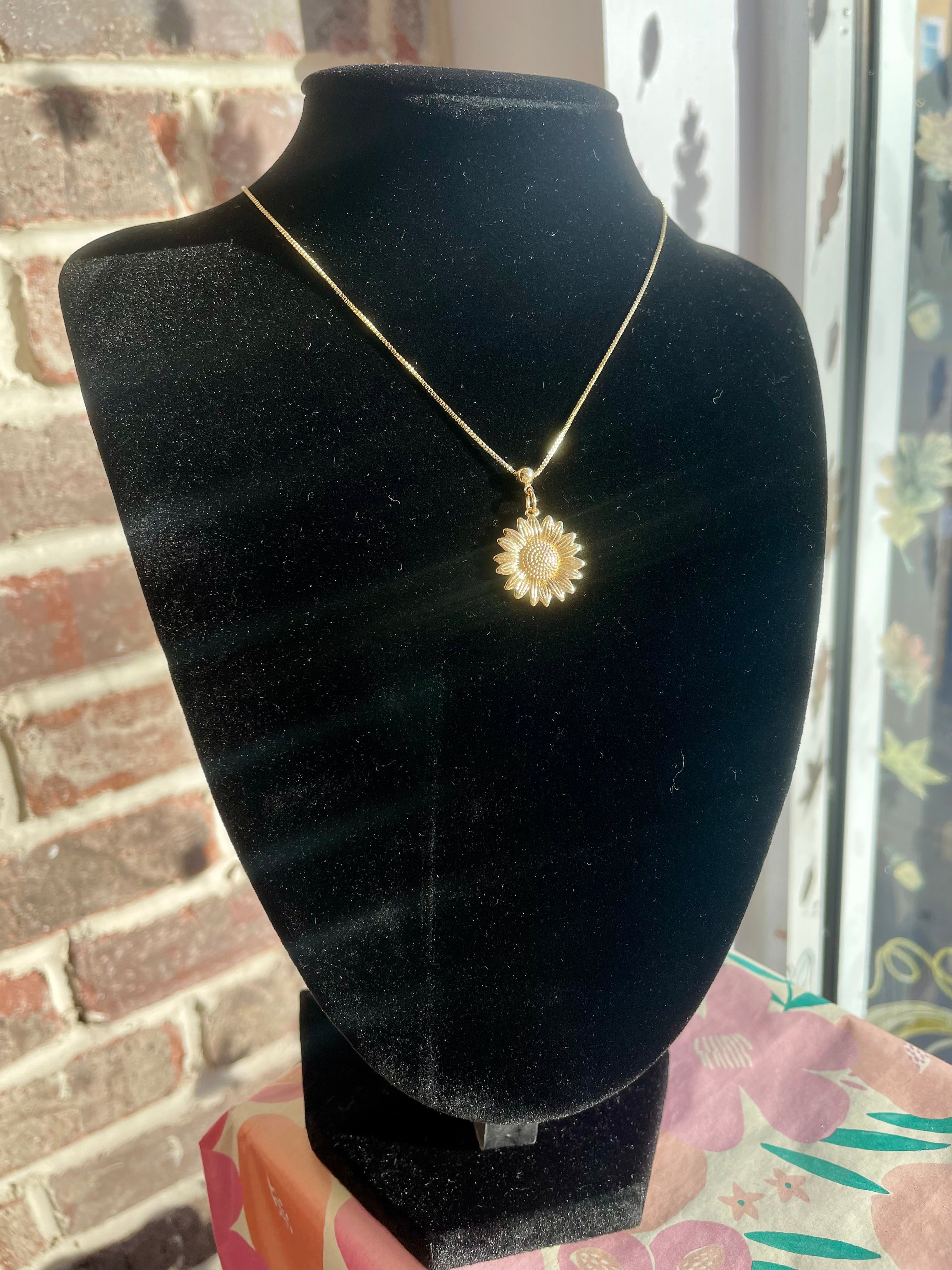 - This bespoke necklace features a sleek & stylish box chain and a beautiful sunflower charm!