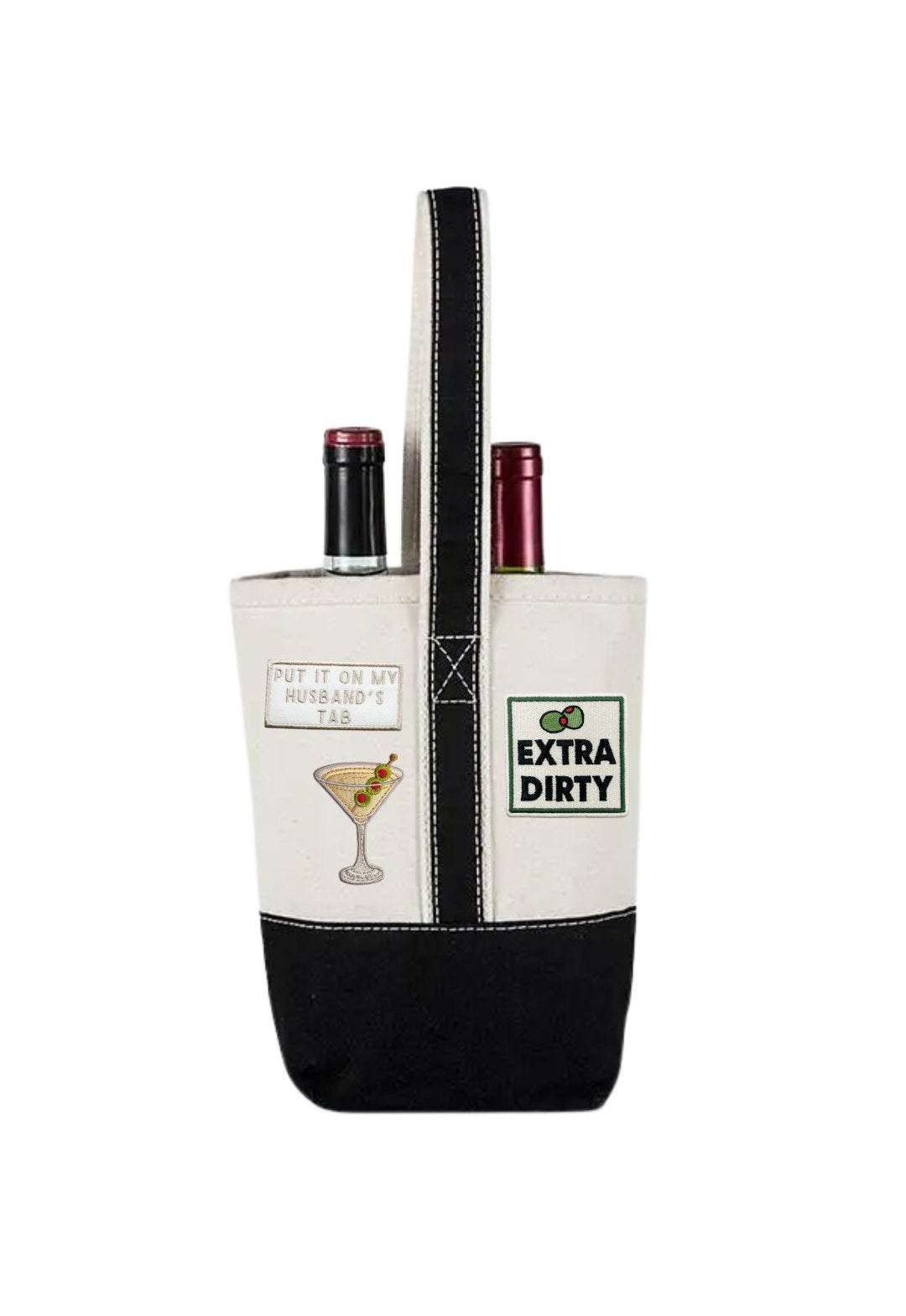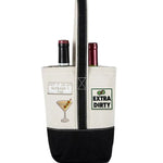Black Double Wine Bottle Tote Bag with Dirty Martini Themed Patches