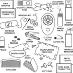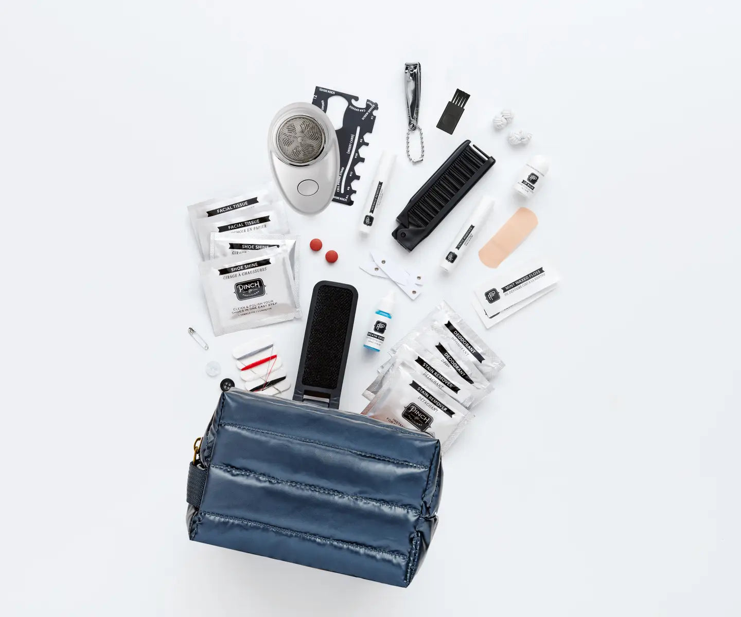 This 30-piece emergency kit includes: (2) stain remover towelettes, (2) deodorant towelettes, electric razor with cleaning tool, (2) collar stays, static remover, breath drops, (2) adhesive bandages, mending kit, safety pin, lip balm, pain reliever, extra buttons, nail clipper, wrinkle remover, (2) dental floss, multipurpose card tool, mini comb, lint brush, (2) cufflinks, (2) facial tissues and (2) shoe shine towelettes.