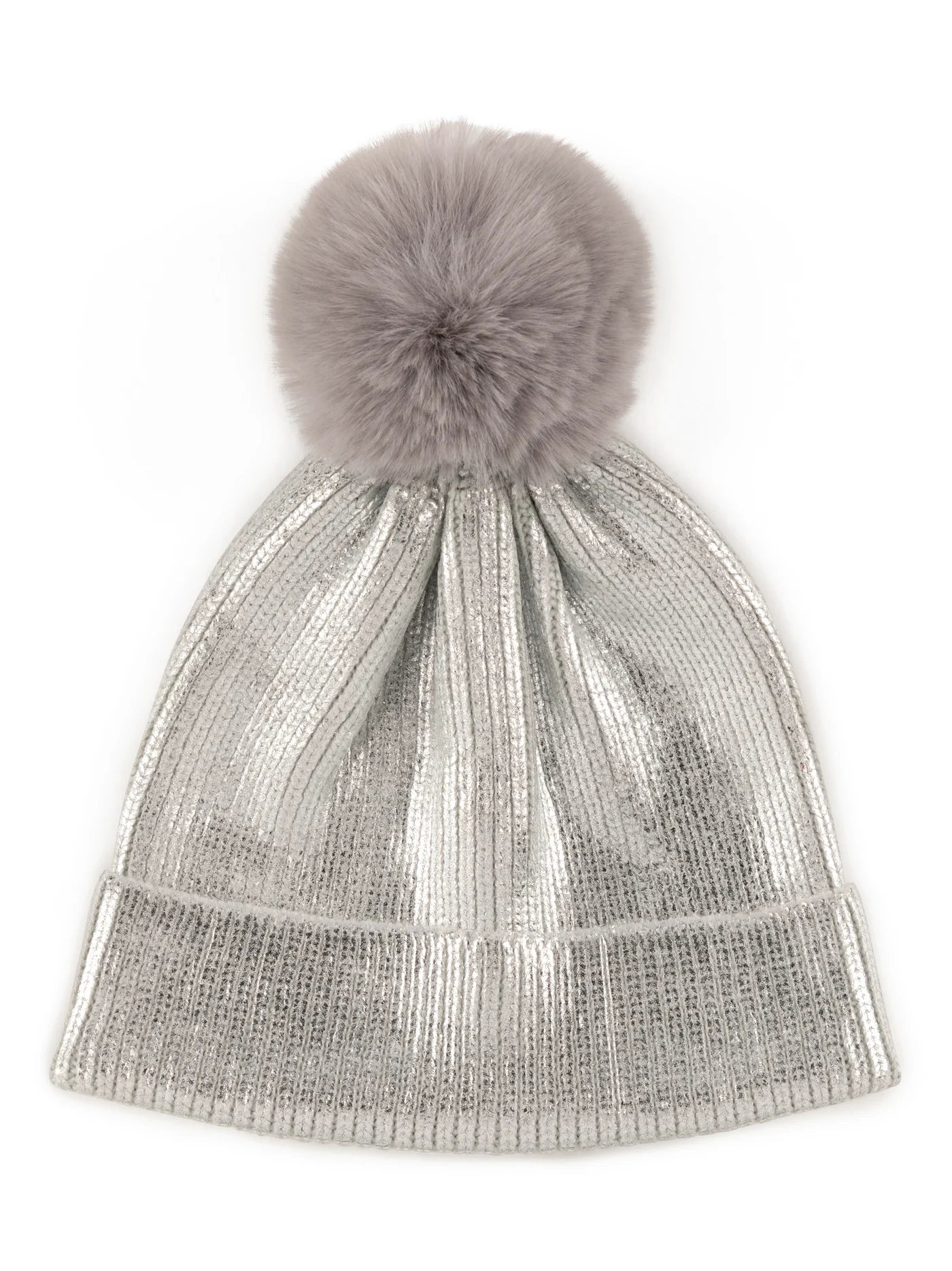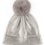 Keep your winter style festive and fun with this metallic silver beanie. Made from soft and durable polyester fabric, this trendy and functional style piece uses a metallic silver print for a festive vibe with a matching top pom detail.