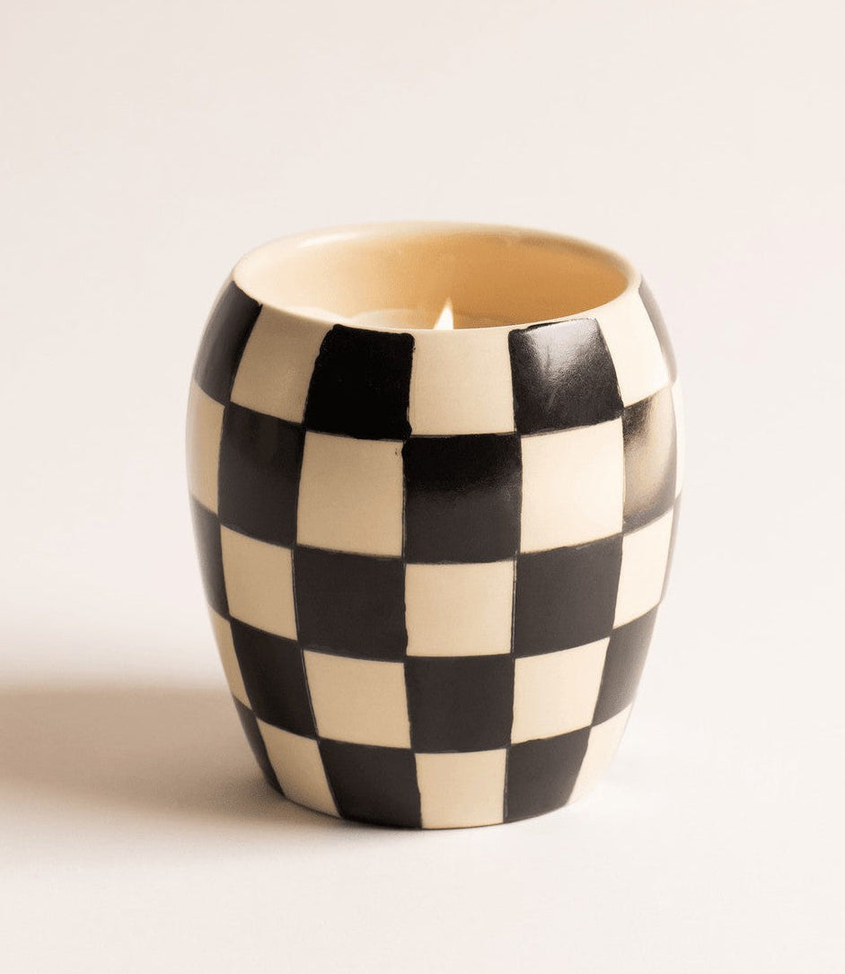 This checkered porcelain vessel is hand painted, making each one unique; collect them all and use as mugs, vases, or statement pieces when the candles are finished