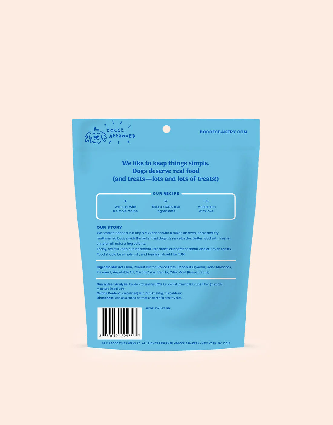 Ingredients: Oat Flour, Peanut Butter, Rolled Oats, Coconut Glycerin, Molasses, Flaxseed, Vegetable Oil, Carob Chips, Vanilla, Citric Acid (Preservative)