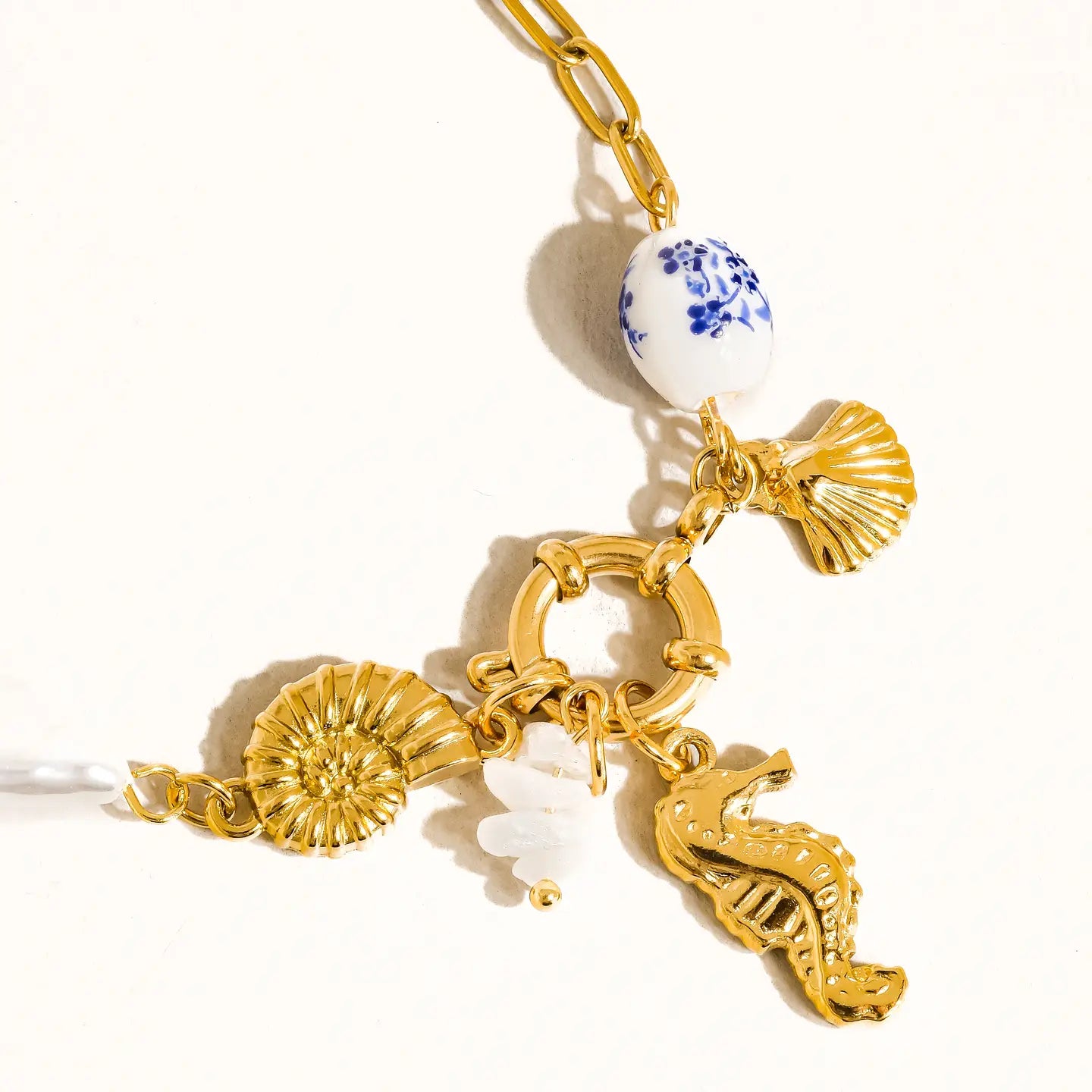 18K Gold Plated Stainless Steel Coastal Seahorse & Shells Charm Bracelet