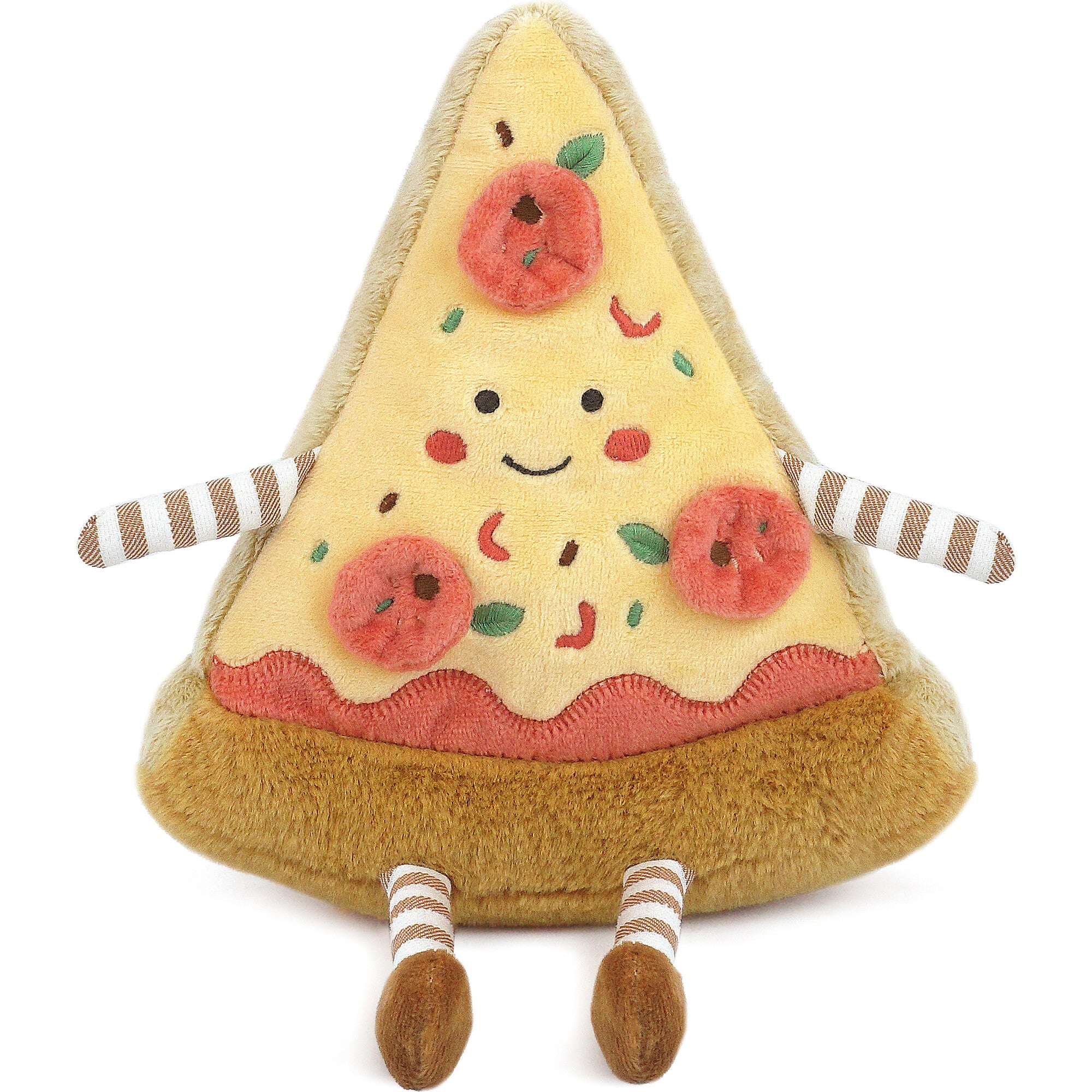This pizza slice is a wonderful wedge of yummy colors. Our soft plush pizza slice has embroidered features such as rosy cheeks, a sweet smile, whimsical striped arms & legs, tow-tone colored crust and topped with the classic pepperoni topping. A slice of playtime fun for all ages.