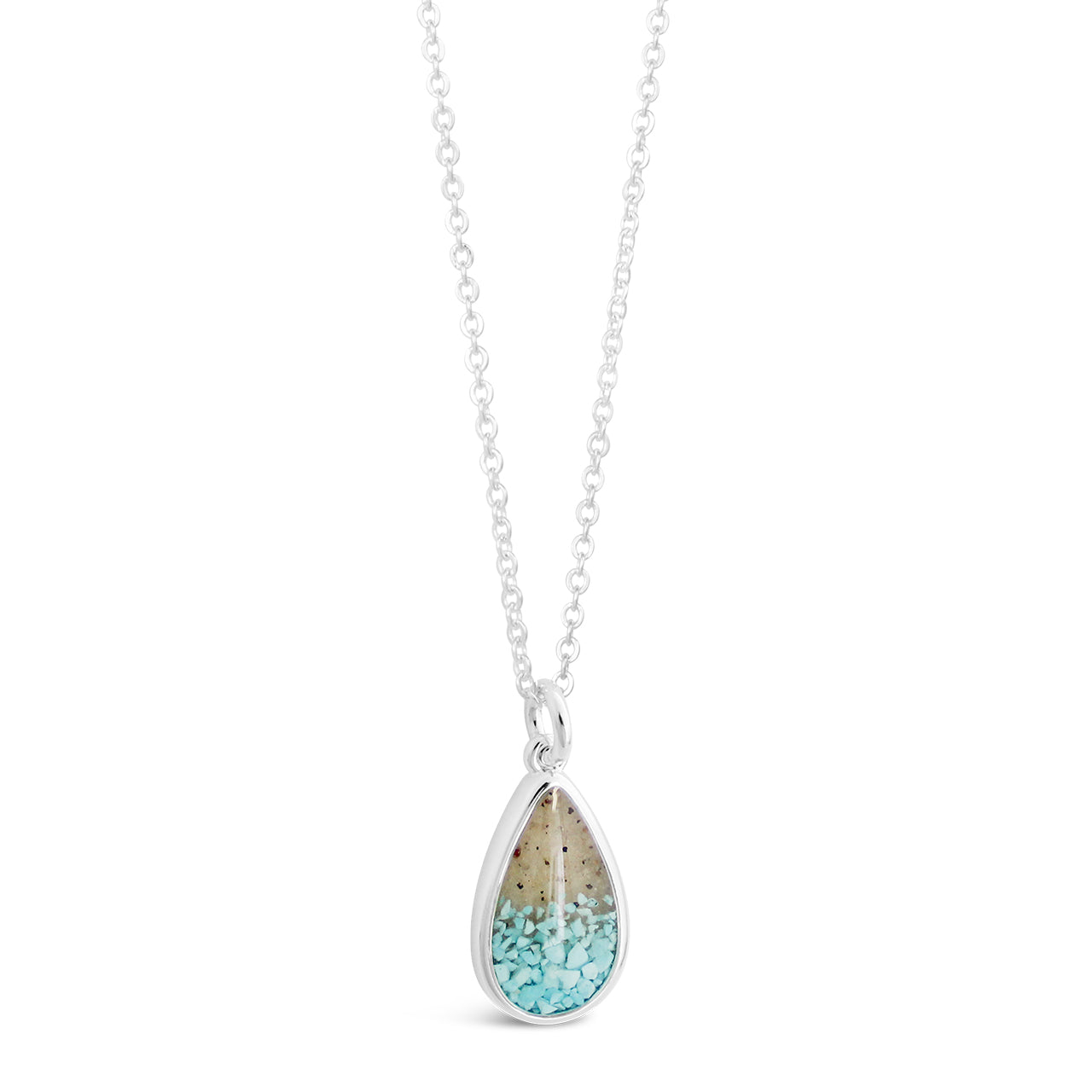 Our Silver Plated Teardrop Shaped Necklace is hand-crafted featuring our Gradient Technique with Turquoise Power Stone and Sand from the Jersey Shore with a slightly domed, gem-like finish.