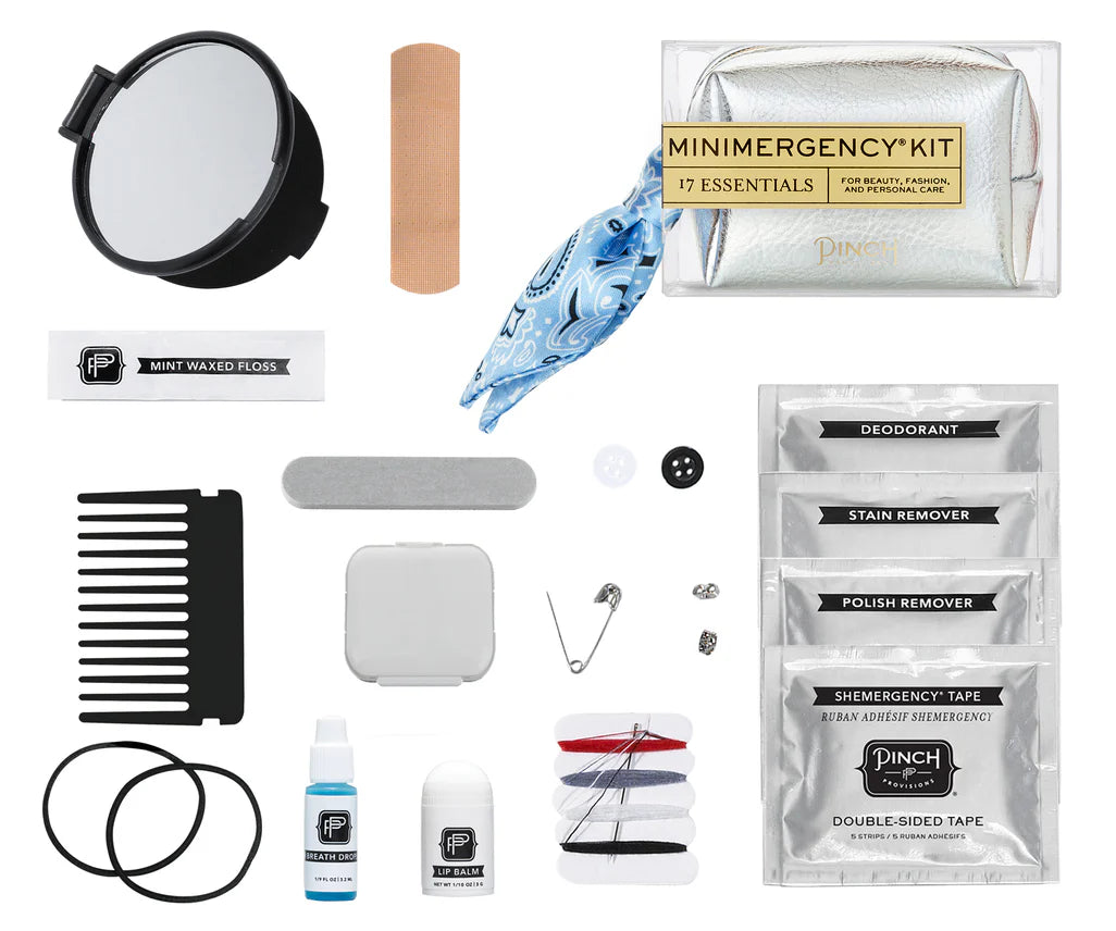 The kit contains 17 essentials: pill container, compact mirror, nail polish remover, emery board, lip balm, earring backs (2), comb, hair ties, mending kit, safety pin, double-sided tape, stain remover, deodorant towelette, pain reliever, extra buttons, breath freshener, dental floss and an adhesive bandage.