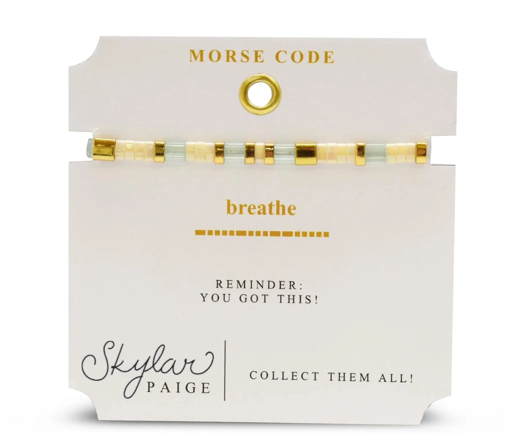 Stretch bracelet features vibrant glass beads arranged to spell out "BREATHE" in Morse code