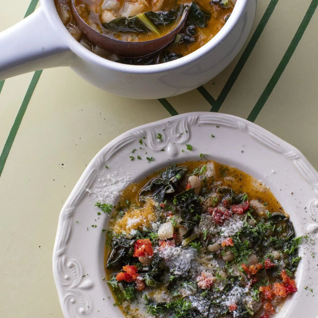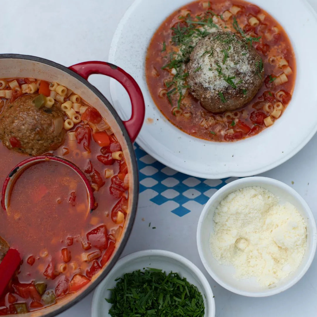 Soups: Giant Meatball Soup in Beefy Tomato Broth; Crab Congee; Creamy Sausage Soup with Rapini and Tortellini; Caldo de Pollo