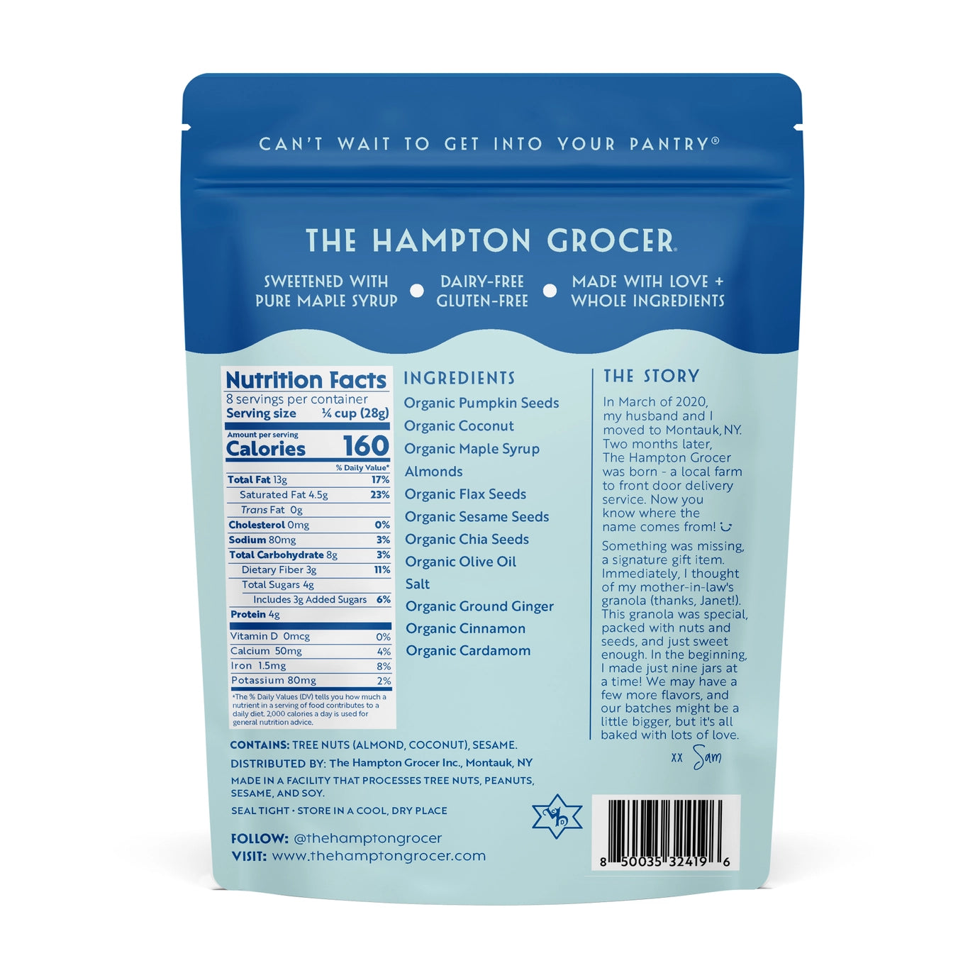 Organic Pumpkin Seeds, Organic Coconut, Almonds, Organic Maple Syrup, Organic Flax Seeds, Organic Sesame, Organic Chia Seeds, Organic Olive Oil, Kosher Salt, Organic Ground Ginger, Organic Cinnamon, Organic Cardamom