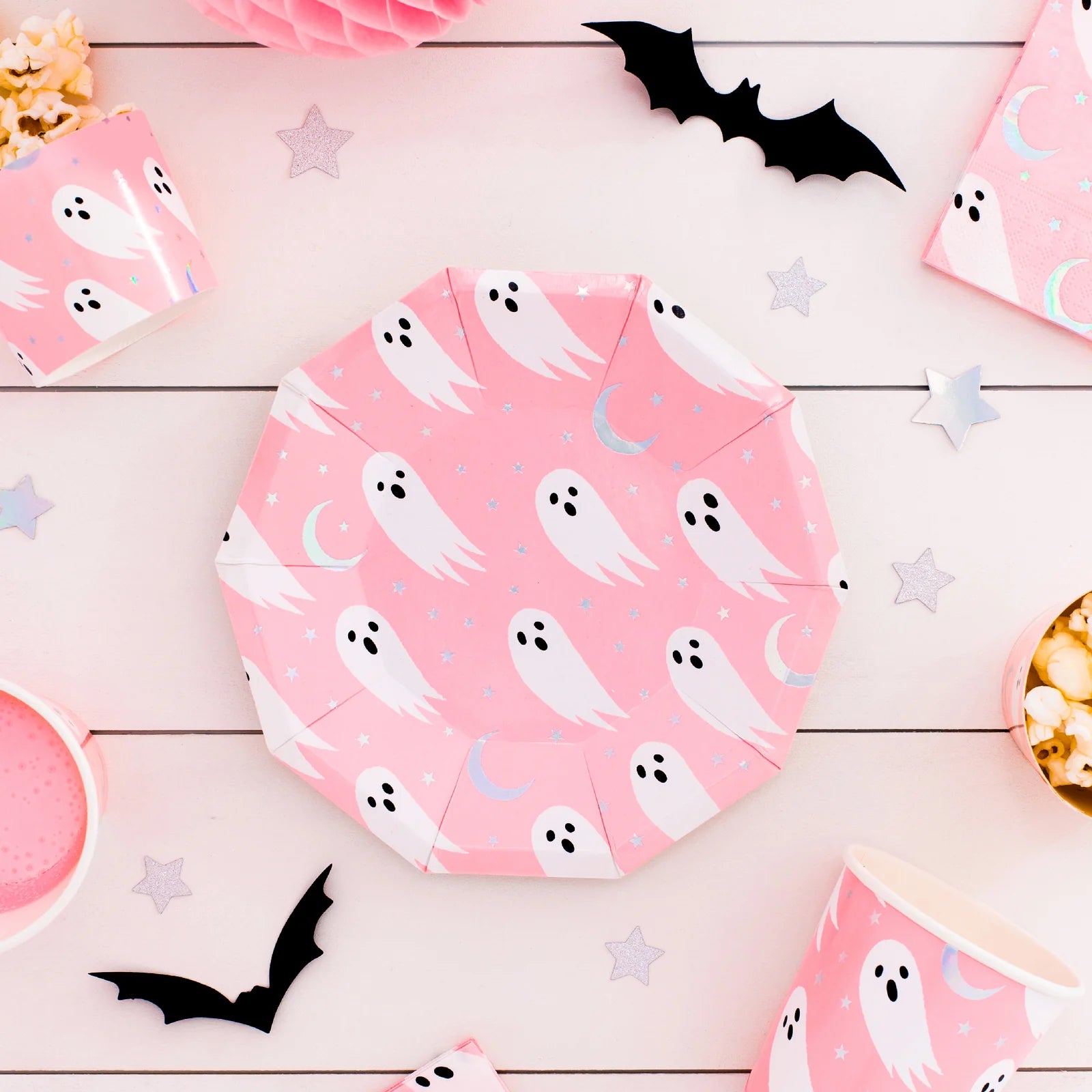Oh hey, boo! Featuring holographic silver foil and neon coral, these Halloween ghost plates are seriously spooky!