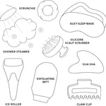 Each set includes 8 premium spa essentials for the ultimate at-home pampering session: full-size ice roller, silky sleep mask, gua sha, exfoliating mitt, acetate hair clip, lavender shower steamer, scalp massager, and silky scrunchie.