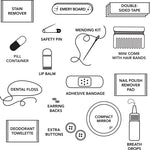 The kit contains 17 essentials: pill container, compact mirror, nail polish remover, emery board, lip balm, earring backs (2), comb, hair ties, mending kit, safety pin, double-sided tape, stain remover, deodorant towelette, pain reliever, extra buttons, breath freshener, dental floss and an adhesive bandage.