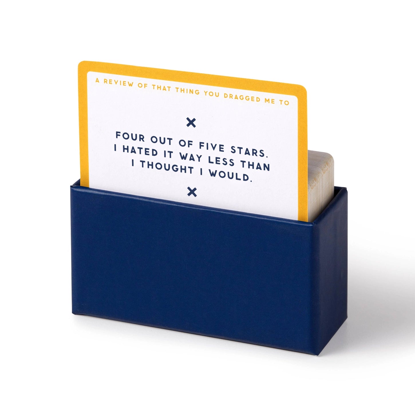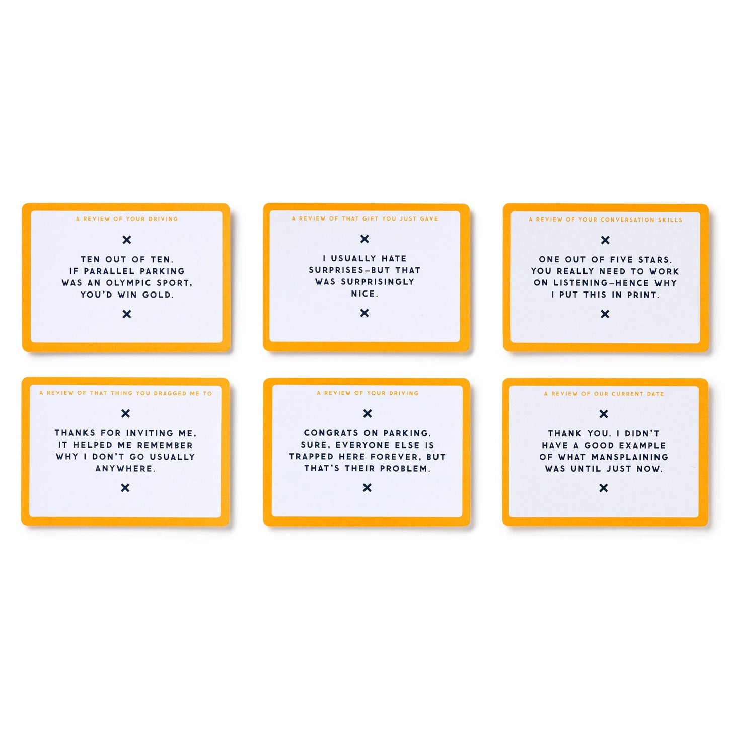 There are cards for everything from ‘You are really talented at being a terrible driver’ to ‘My compliments on the intercourse. Your hard work didn’t go unnoticed.’ You’ll be ready to review anything–including this product description. We’d give it three lackluster stars...at best.