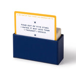 - Includes 100 double-sided cards–with each featuring a unique review on the front.