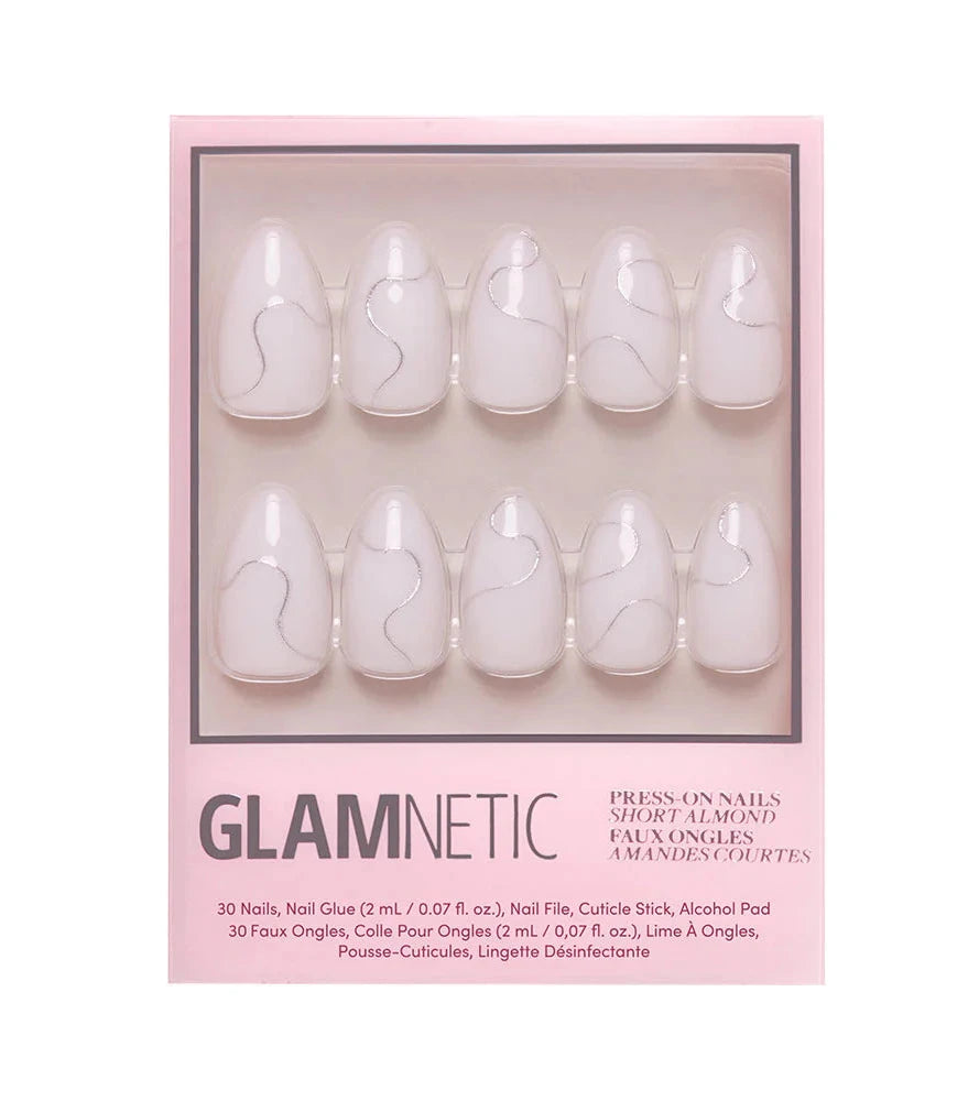 Show off your winter style game with the Silent Night nail set. This classic design with a twist features a natural, semi-transparent white base with silver 3D swirls you'll love to dress up or down. Plus, the always-in-style short almond shape is perfect to pair with all your casual to glam looks this holiday season.