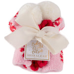 Kick off your shoes at the door and step into comfort with our Peppermint Home Socks. These adorable ankle height socks feature a pattern of circular, striped peppermint candies on a vibrant pink background with a feminine pom-pom detail on each ankle. With durable rubber grips on the bottom, these make the perfect pair of comfy footwear to wear throughout the house as you celebrate the season in style.