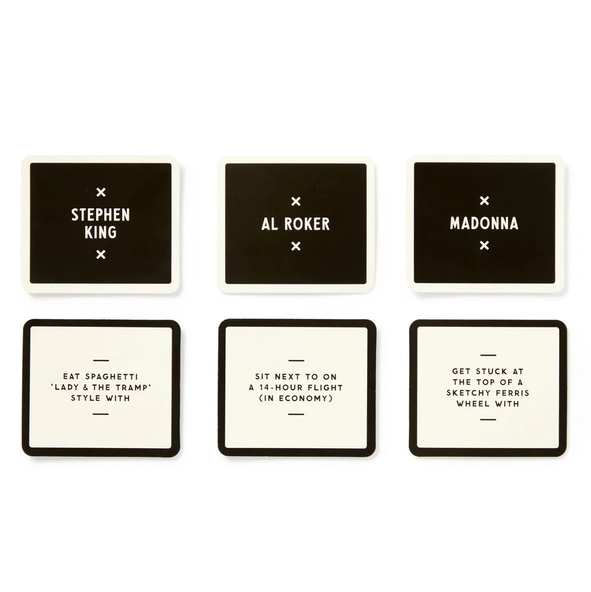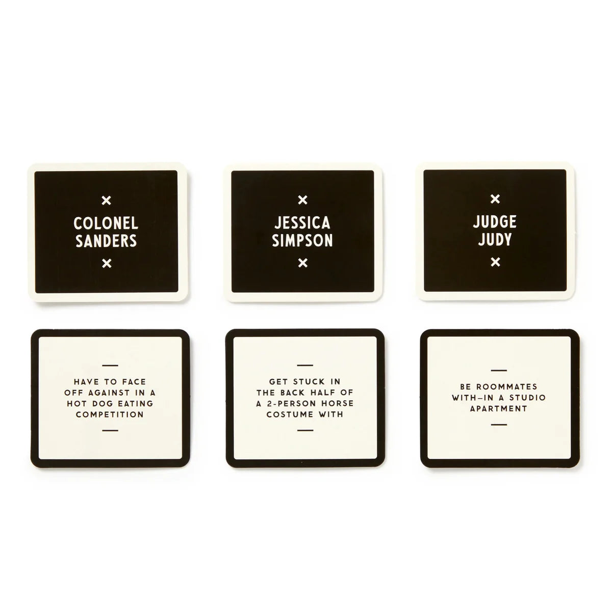 HOW TO PLAY - Players draw 3 random ‘celebrity’ cards and 3 equally random ‘activity’ cards–then full-on debate about which would make the ideal pairings. There’s a catch though–you’re not deciding which ones you would pick, but what you think that round’s ‘judge’ would choose. Aka, you win points for knowing just how weird your friends are.