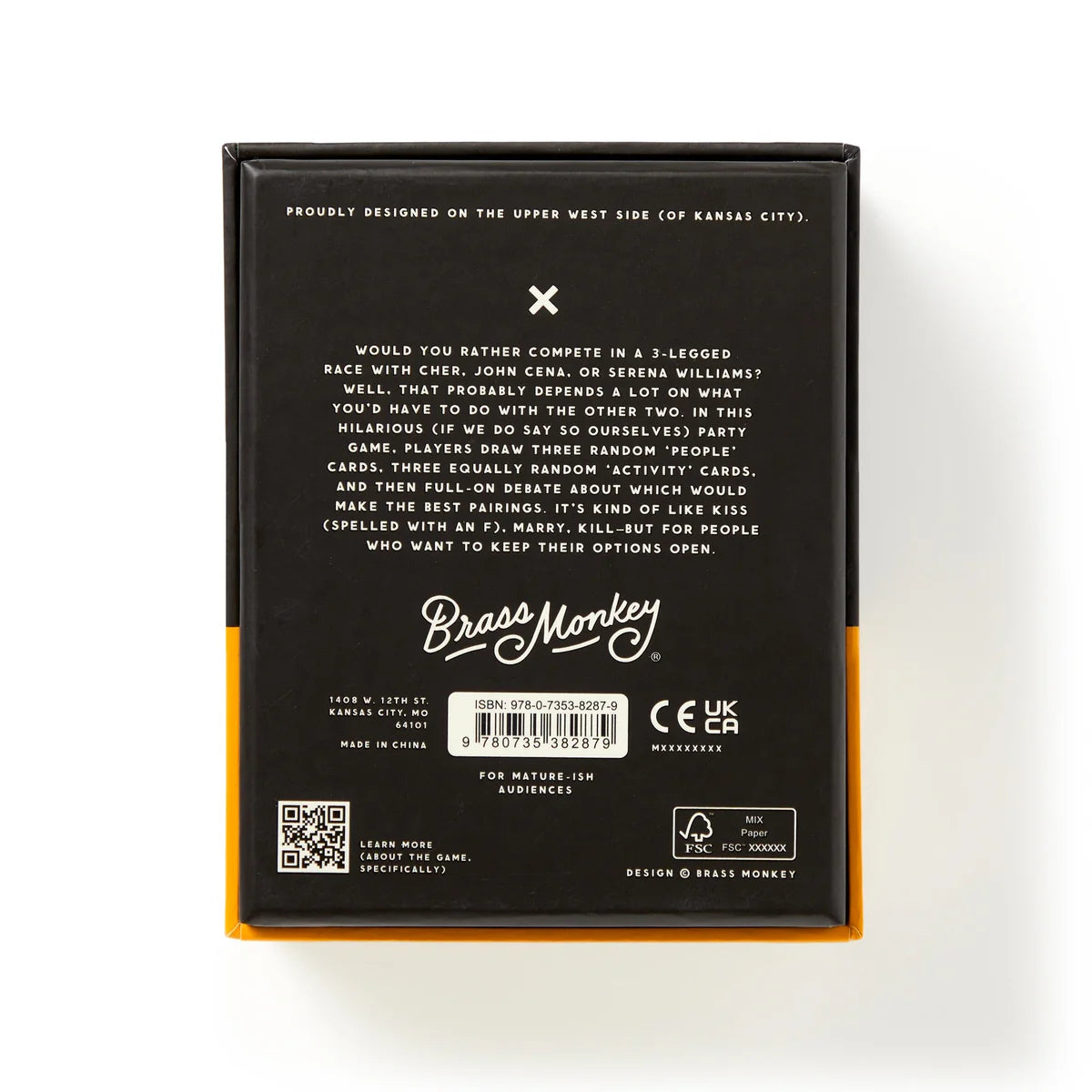 SOCIAL GAME – Would you rather compete in a three-legged race with JFK, Madonna, or Serena Williams? Well, that probably depends on what you’d have to do with the other two. Consider this ‘Kiss*, Marry, Kill’ for people who are tired of the same old options.