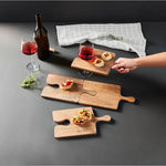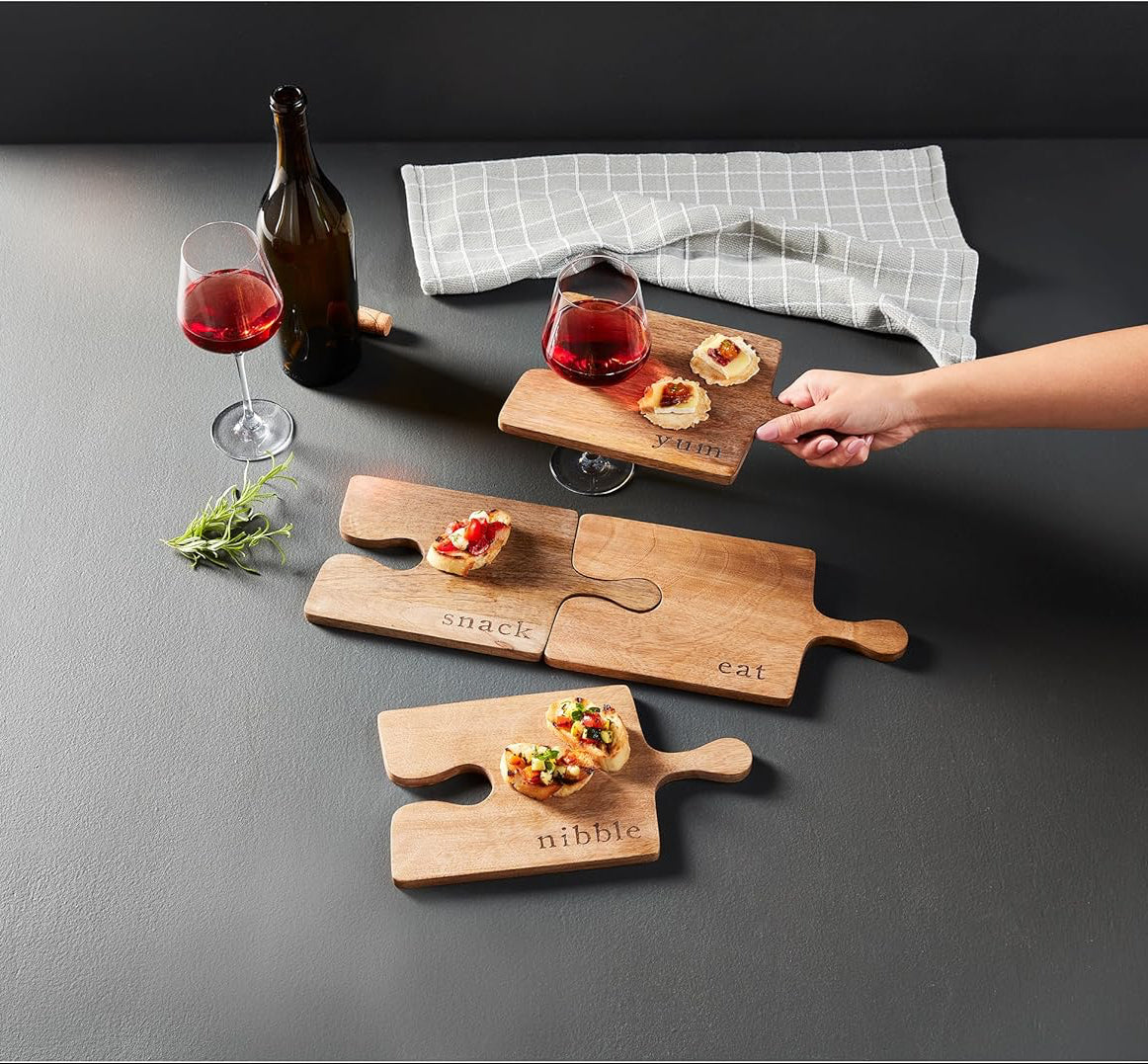 The Puzzle Tapas Board Set is a must-have for every kitchen, offering both versatility and style. Made from engraved mango wood, this 4-piece set features paddle boards that are shaped like puzzle pieces, allowing you to connect them together to create a large board. Perfect for serving tapas, each individual board also includes a convenient groove for holding stemware. Cleaning is a breeze with a simple hand wash or wipe with a damp cloth, but be sure to avoid soaking. Crafted from mango wood, this set not only serves its purpose but also adds a touch of natural beauty to your dining experience.