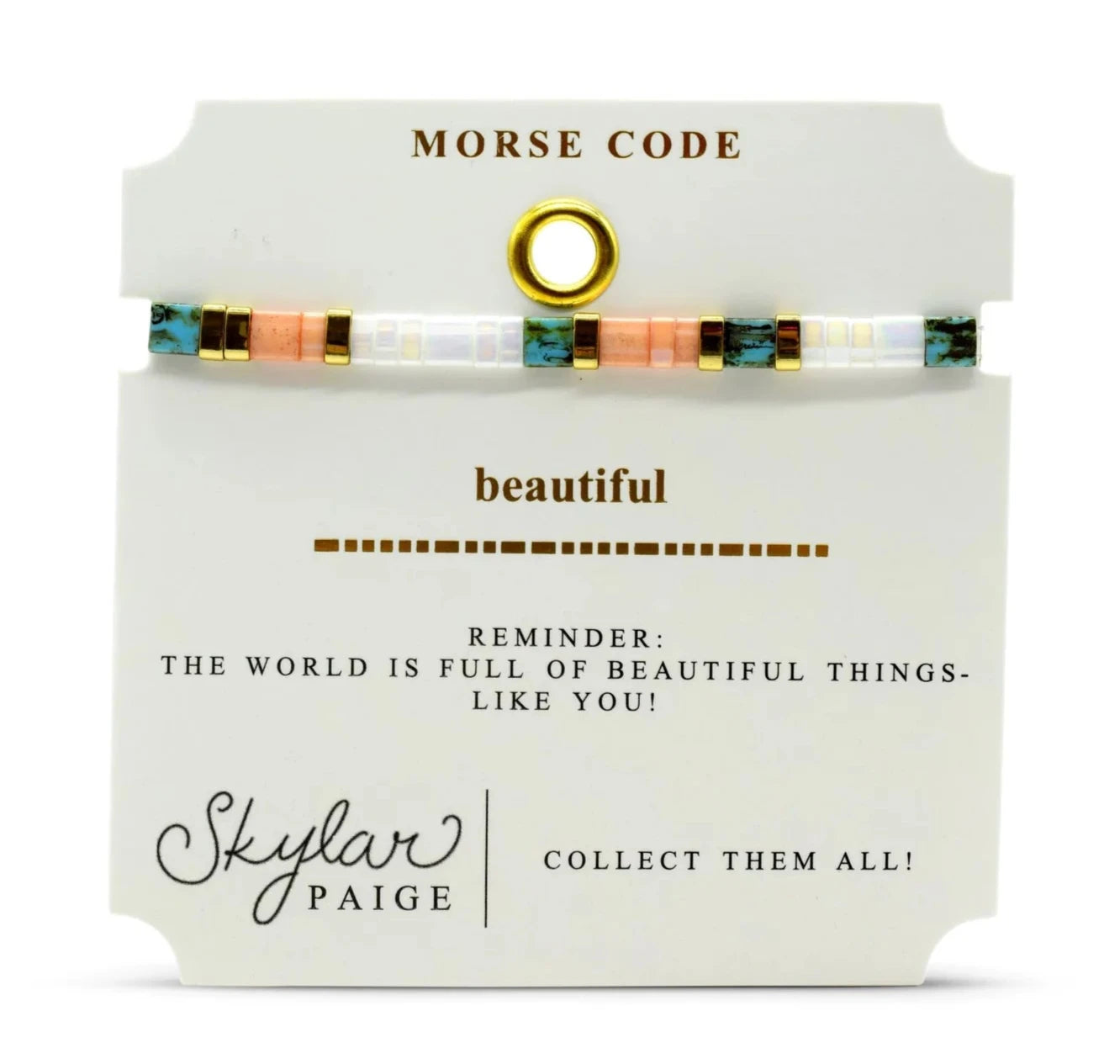 Featuring vibrant glass beads arranged to spell out "BEAUTIFUL" in Morse code, this stretch bracelet from Skylar Paige makes a wonderful present for someone special, or a stylish pick-me-up that looks great in any setting.