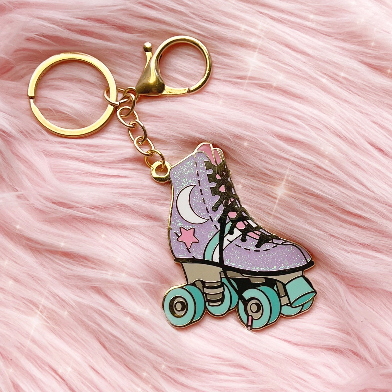 Time to Sparkle! Take a trip to the roller disco with this super cute roller skate keychain. Hard enamel in lilac, pastel pink, & blue trimmed with gold, and glitter star & crescent moon details.