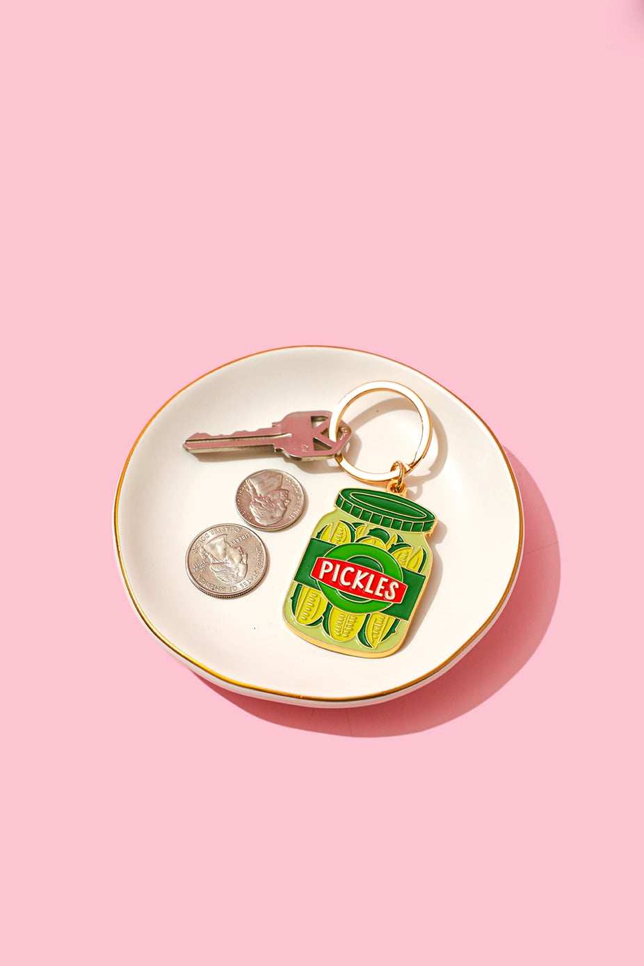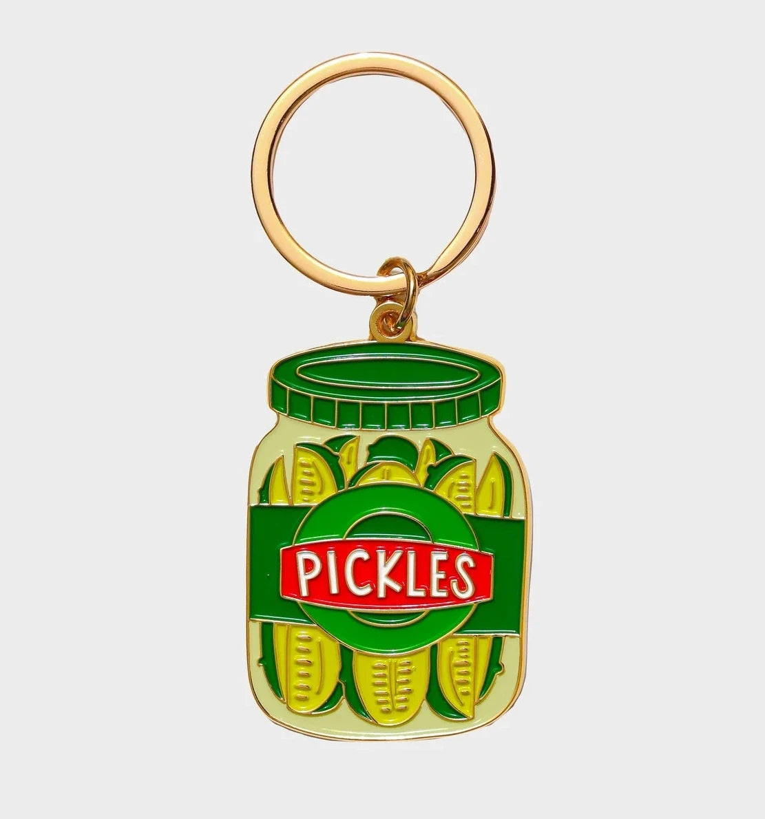 This trendy, pickle jar enamel keychain is the perfect way to add cuteness to your keys or bag!