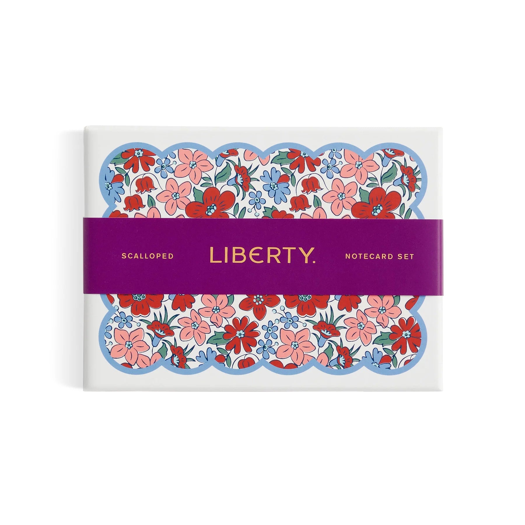 Liberty London is known for its floral and graphic prints and the offering of innovative and eclectic designs. The Liberty Scalloped Shaped Notecard Set includes: 8 scalloped shaped notecards, each with a unique floral design from the Liberty Archive, coordinating with a floral-printed envelope.