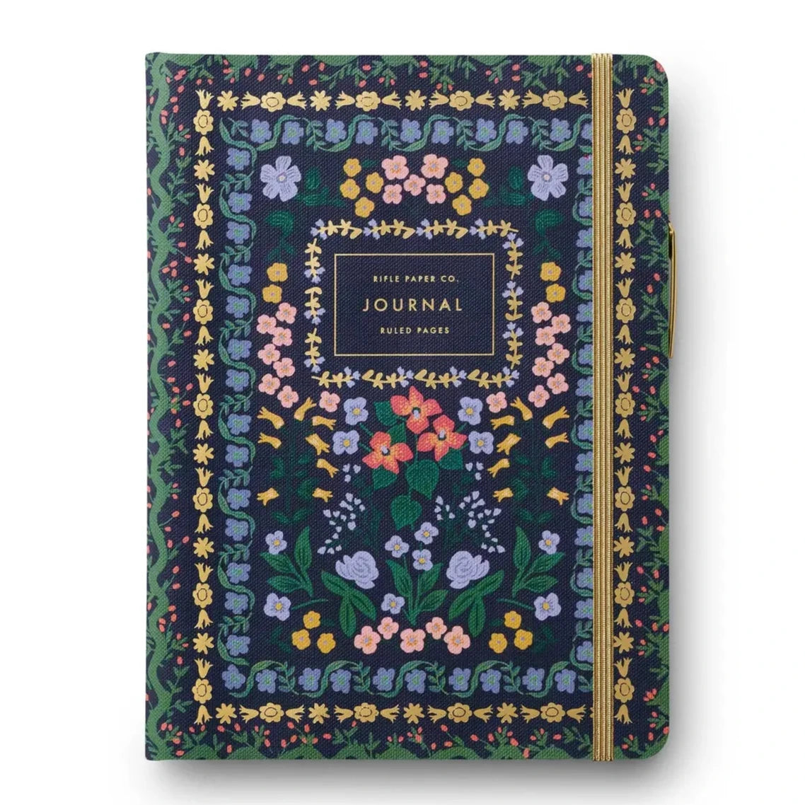 Designed for note takers and journalers, this hardcover journal comes with a gold pen with black ink, and features 144 ruled pages, an elastic band, and a pocket for extra storage.