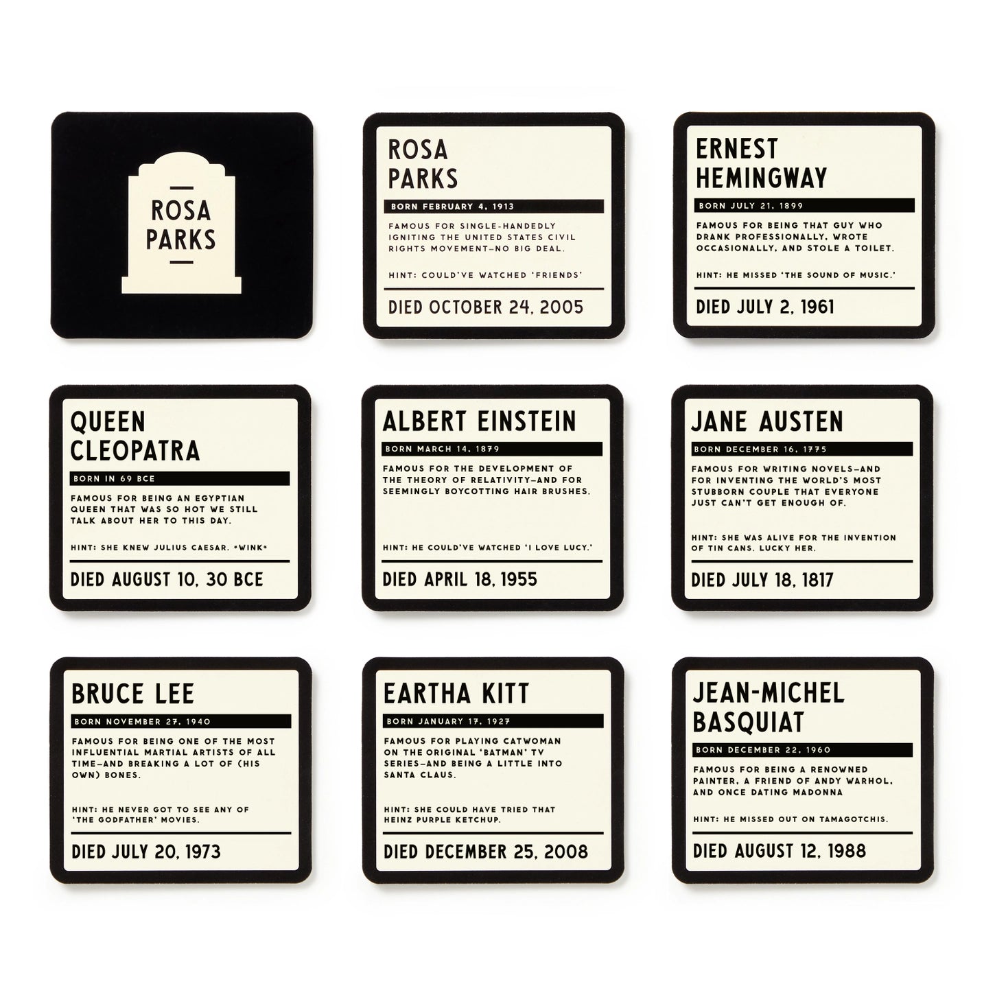 In this hilarious social game, players compete by putting their random celebrity and historical figure knowledge to the test–while trying to remember what year people died (or if they even have). When did Albert Einstein pass away? 1897? 1986?