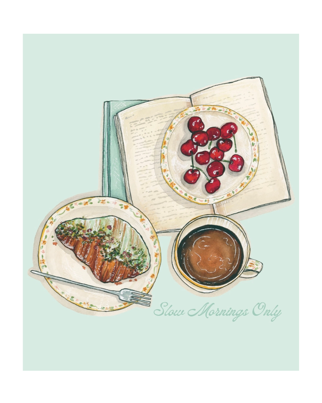 Slow Mornings Only Art Print is a print of a hand drawn, watercolor painting by artxnikki. It features the makings of a perfect slow morning: croissant, fruit, coffee/tea, a book, and a journal. May every morning be a slow and wonderful morning.
